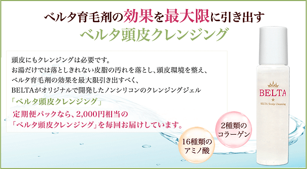 この頭皮クレンジングは頭皮の皮脂や汚れを取り除くことによって頭皮環境を整え、ベルタ育毛剤がより頭皮に浸透するための補助的な役割をしますので、これを使うことによってベルタ育毛剤は100%の効果を発揮します。