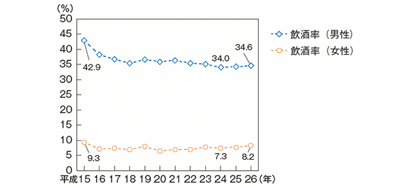 この背景にはタバコ同様女性の社会進出が影響していると思われ、社会に出る女性が増えた結果お酒を飲む機会も増え飲酒が日常的になったと見られています。事実男女全体の飲酒率を見ても差が縮まってきていますよね。